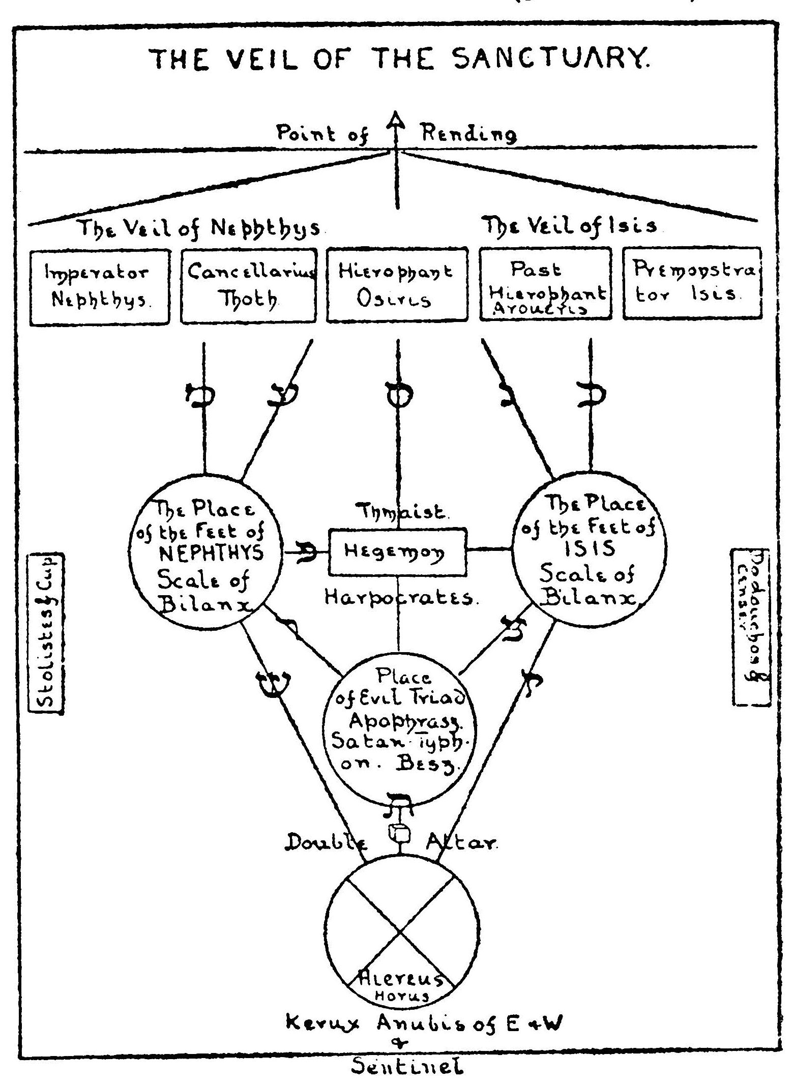 Um templo da HOGD é governado por três oficiais: o Hierofante (de ἱεροφάντης), o Hegemon (de ἡγεμών) e o Hiereus (de ῐ̔ᾰρεύς). No diagrama do Salão dos Neófitos, vemos os três oficiais dispostos na vertical central.